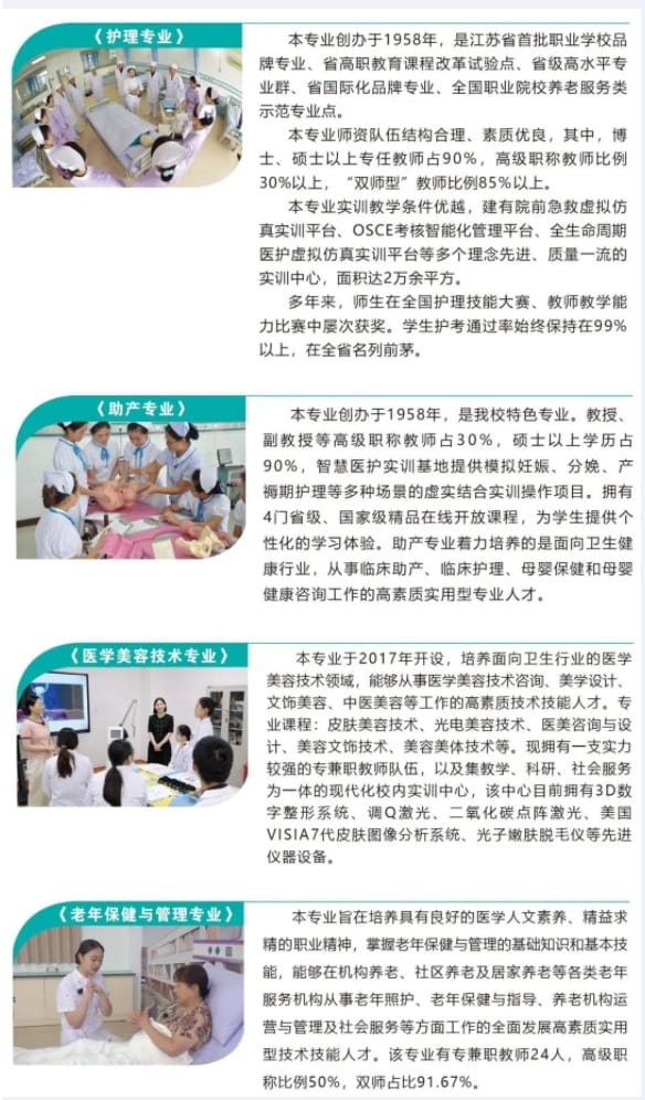 学校设有黄河路和科技路两个校区,共占地800余亩,其中科技路校区由中国工程院院士、东南大学王建国教授主创规划设计,先后获评全国优秀建筑设计一等奖和教育部优秀工程设计一等奖。现有全日制在校学生8000余人,专任教师400余人,其中硕士及以上学位占比75.46%,“双师”型教师占比85.36%,省“333高层次人才”“青蓝工程”等省级人才18人,与南京医科大学、徐州医科大学、南京中医药大学等高校联合举办“3+2”高职本科现代职教体系贯通培养项目。拥有护理、中医学、预防医学、助产、康复治疗技术、医学检验技术、药学等20个专业,其中护理专业被省教育厅立项“国际化人才培养品牌专业建设项目”,获评江苏省首批品牌专业、省级高水平专业群。护理实训中心先后被评为江苏省职业教育优秀实训基地、中央财政支持实训基地建设项目、省教育厅示范性虚拟仿真实训基地建设项目。拥有省工程中心、省社科普及基地2个省级科研平台,以及校地合作共建的千亩药材产业园。建有融教学实训、课程思政、职业体验、社会培训、健康宣教等多功能的跨界融合、跨专业整合、信息化契合、全国一流的智慧医护实训中心。